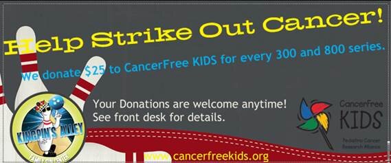 Cancerfreekids.org is the official charity of Kingpin’s Alley. KPA owners, Doug and Alison Bohannon chose this wonderful organization in 2013 shortly before they took ownership of the bowling center. Cancer Free Kids raises money and awareness for pediatric cancer research.
